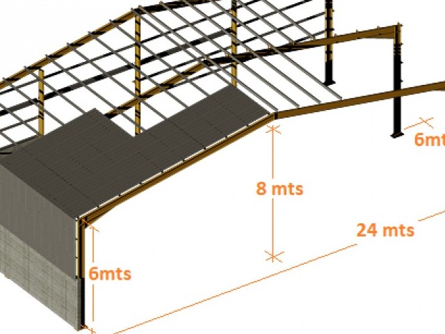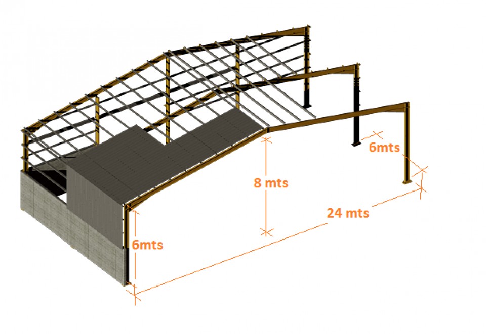 24 metros de ancho x largo variable en módulos de 6 m. (Ej: 24 x 18 m / 24 x 24 m / 24 x 30 m / 24 x 36 m / etc.).